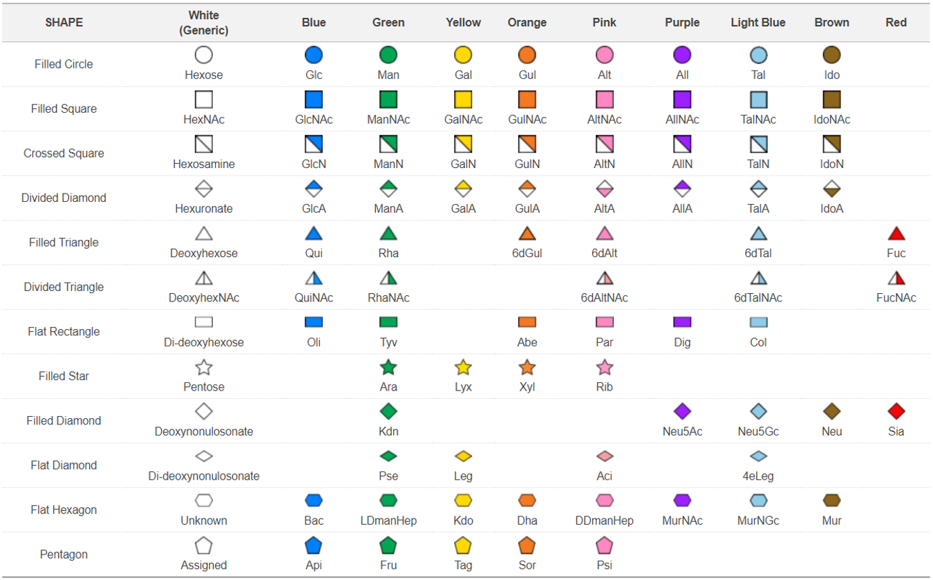 Third Edition of Essentials of Glycobiology - Appendix 1B: Symbol Nomenclature for Glycans (SNFG) Symbol Nomenclature for Graphical Representation of Glycans, Glycobiology 25: 1323-1324, 2015. Citation link (PMID 26543186).